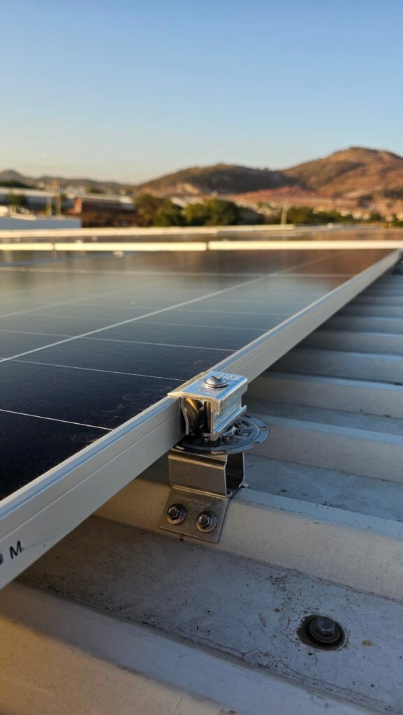 Una parte del techo de la planta ya estaba equipada con un sistema solar convencional con rieles. La instalación fotovoltaica restante se complementó utilizando el sistema de fijación solar sin rieles PVKIT® DirectAttach™ de S-5!, combinado con el RibBracket™ II, diseñado y probado para perfiles de techo metálico trapezoidal. En las secciones de techo construidas sobre losa de concreto, GES utilizó un sistema tradicional con rieles de Unirac, asegurando compatibilidad y consistencia estructural en toda la instalación.